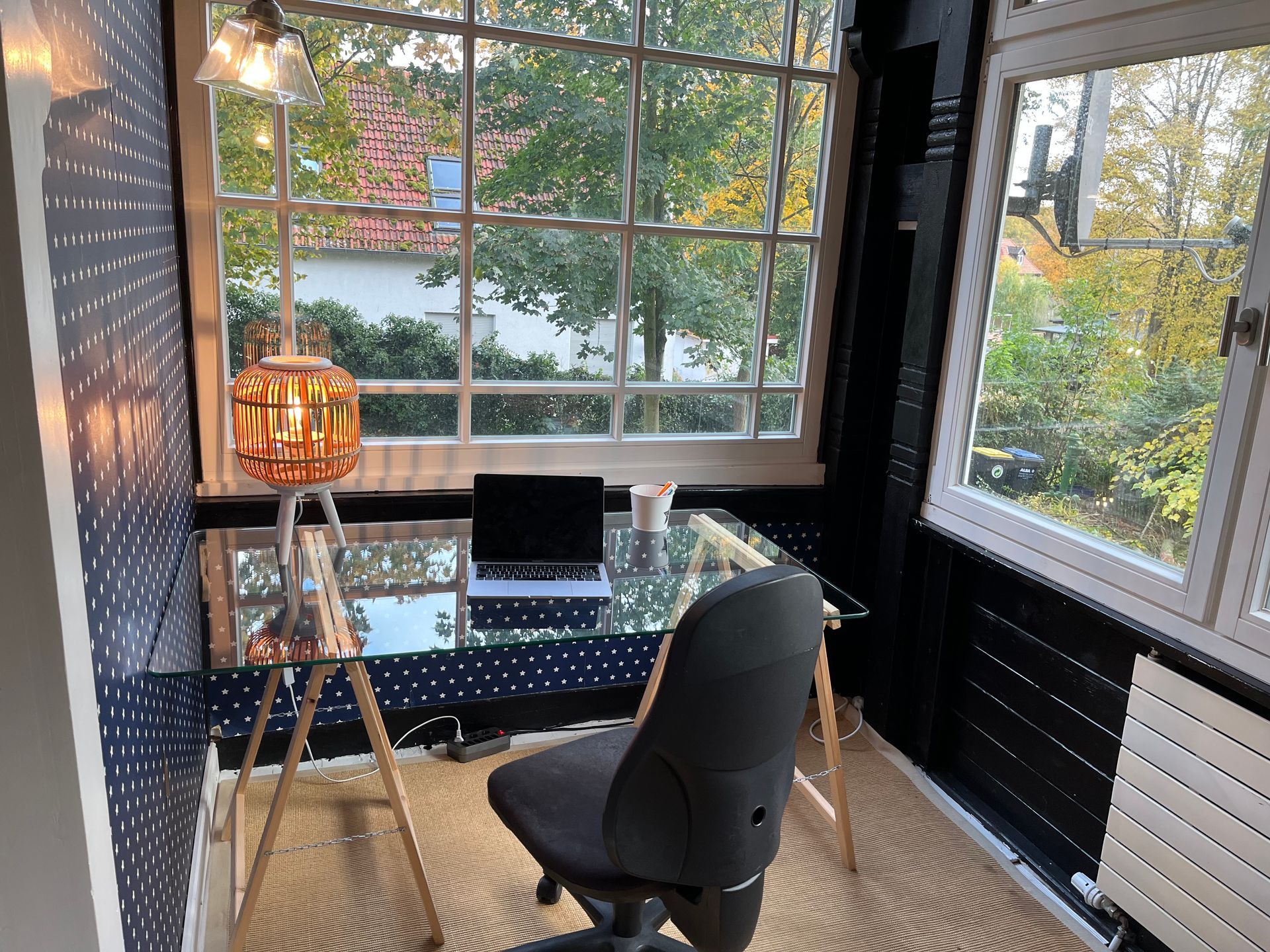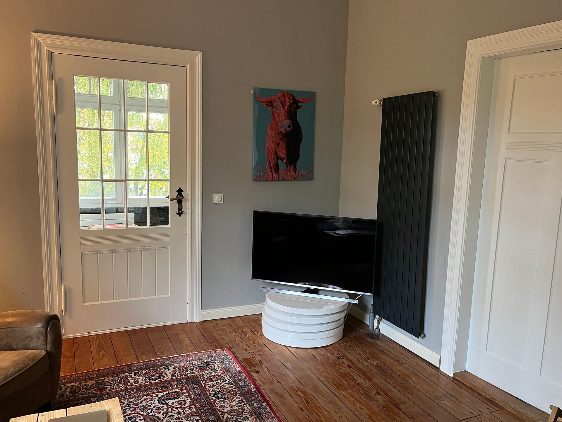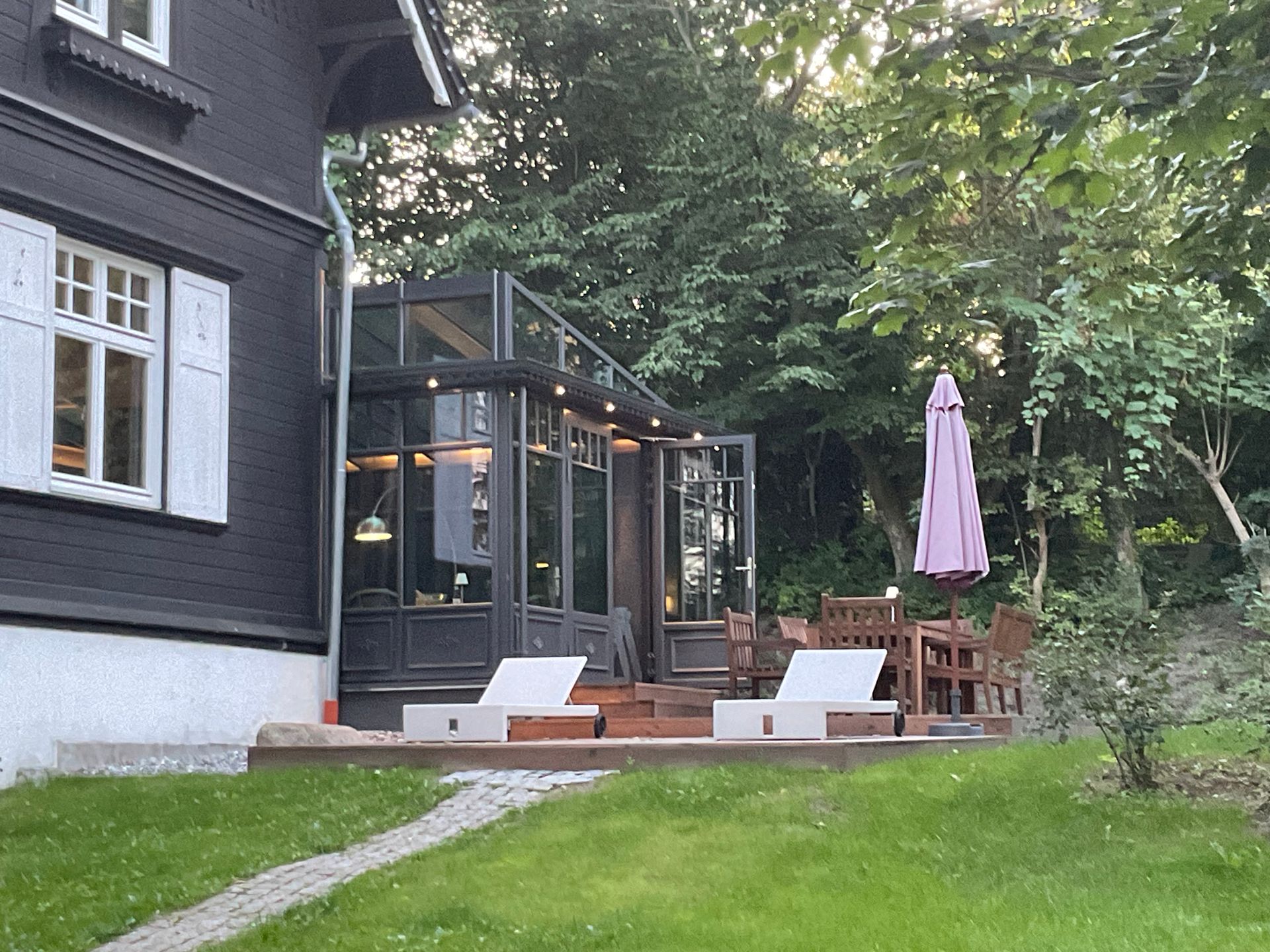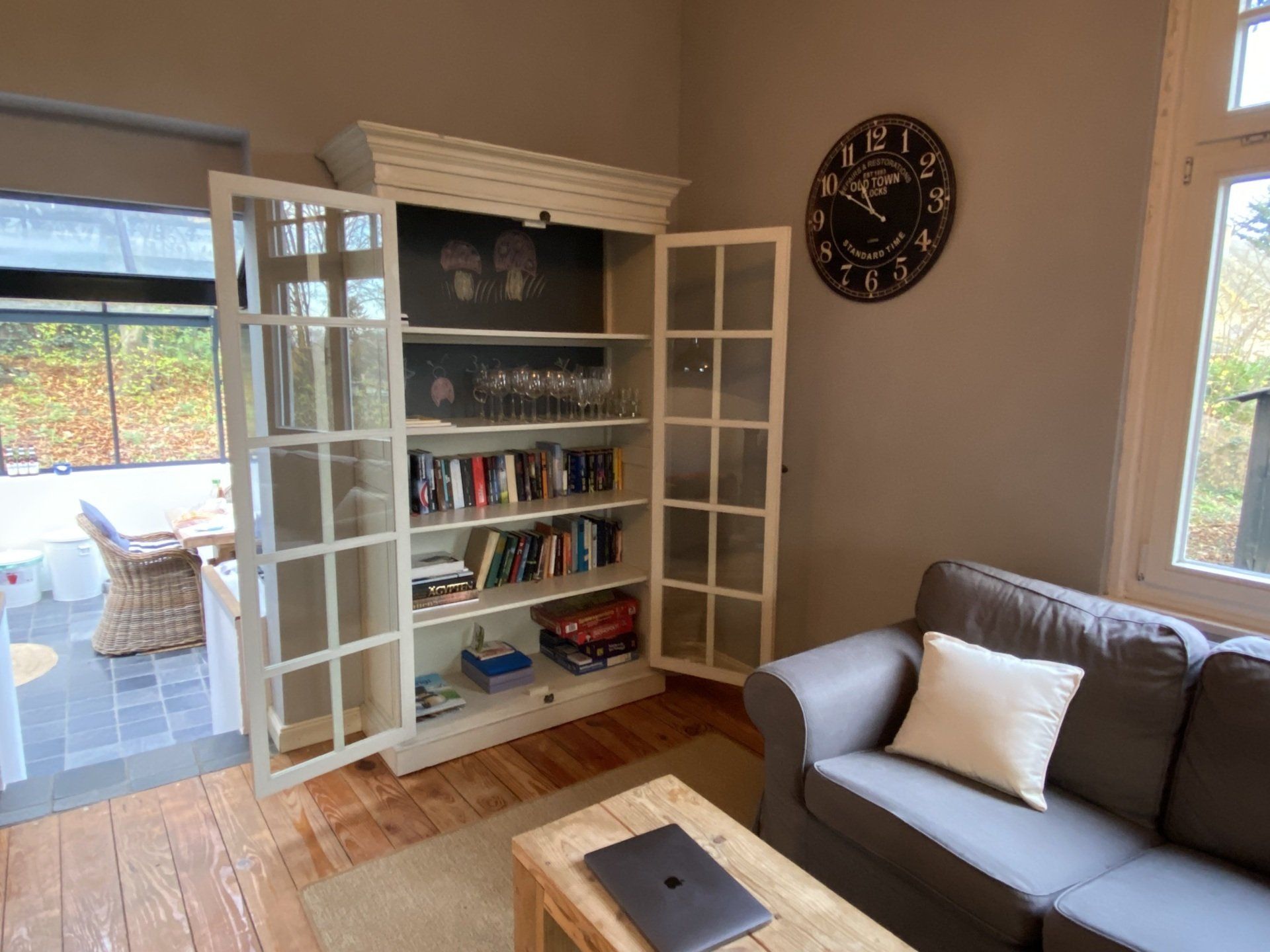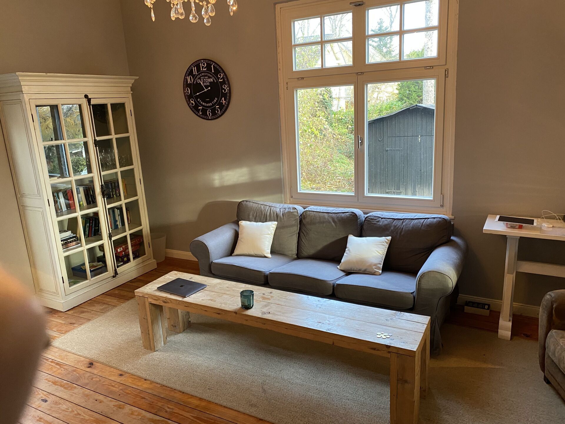 Das gemütliche Wohnzimmer hat als Nebenraum einen geschlossenen Wintergarten, in dem sich ein Daybed zum Lesen und Träumen sowie ein Schreibtisch befindet.