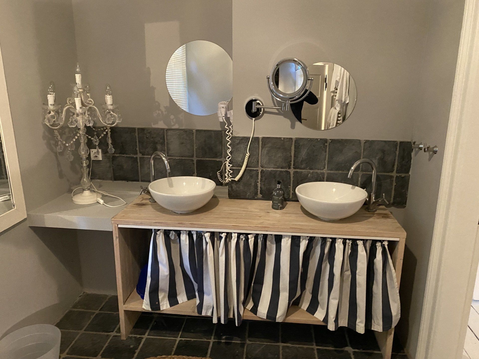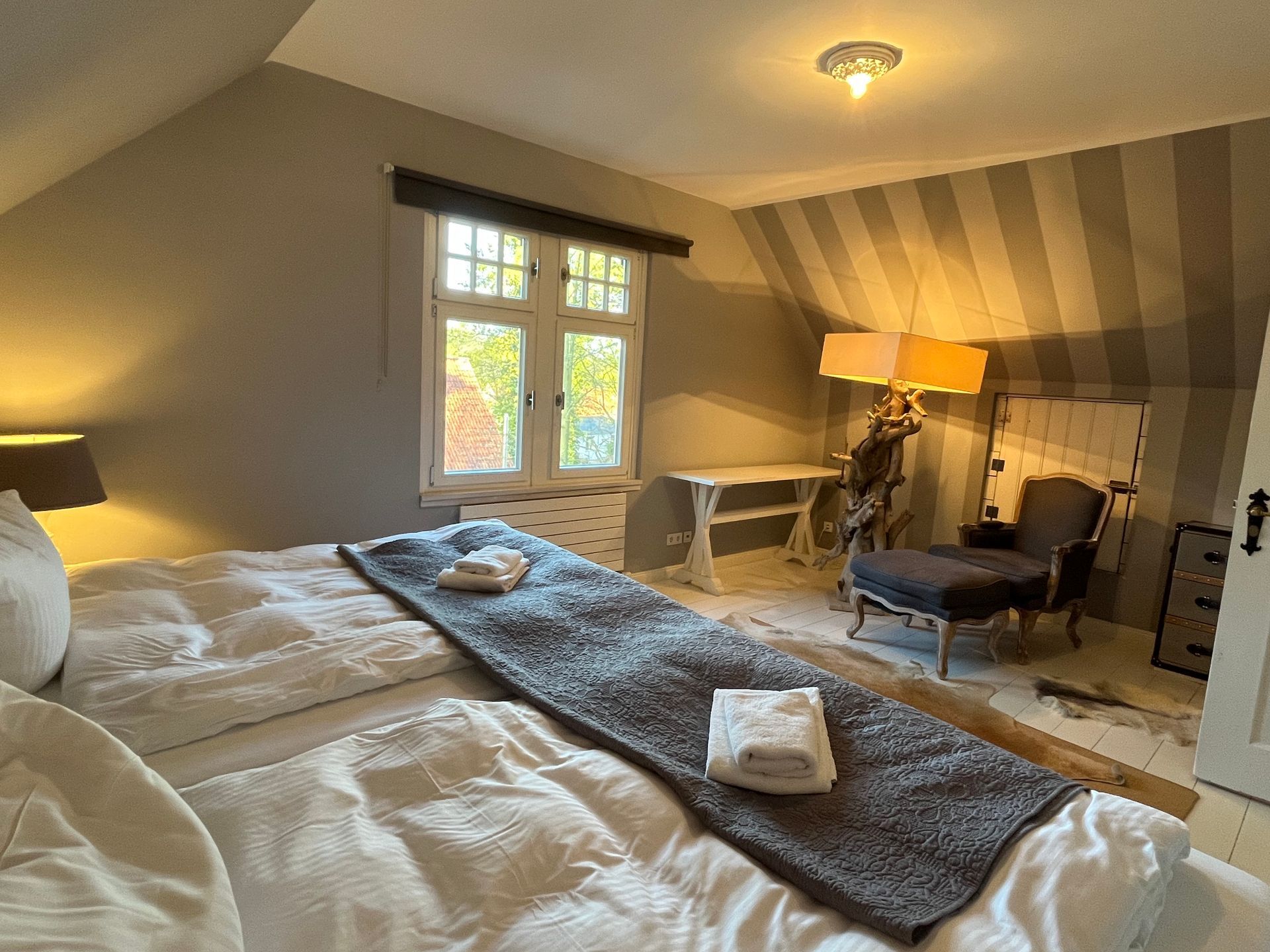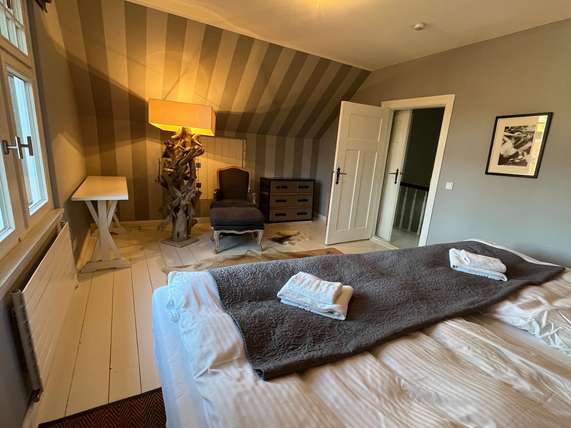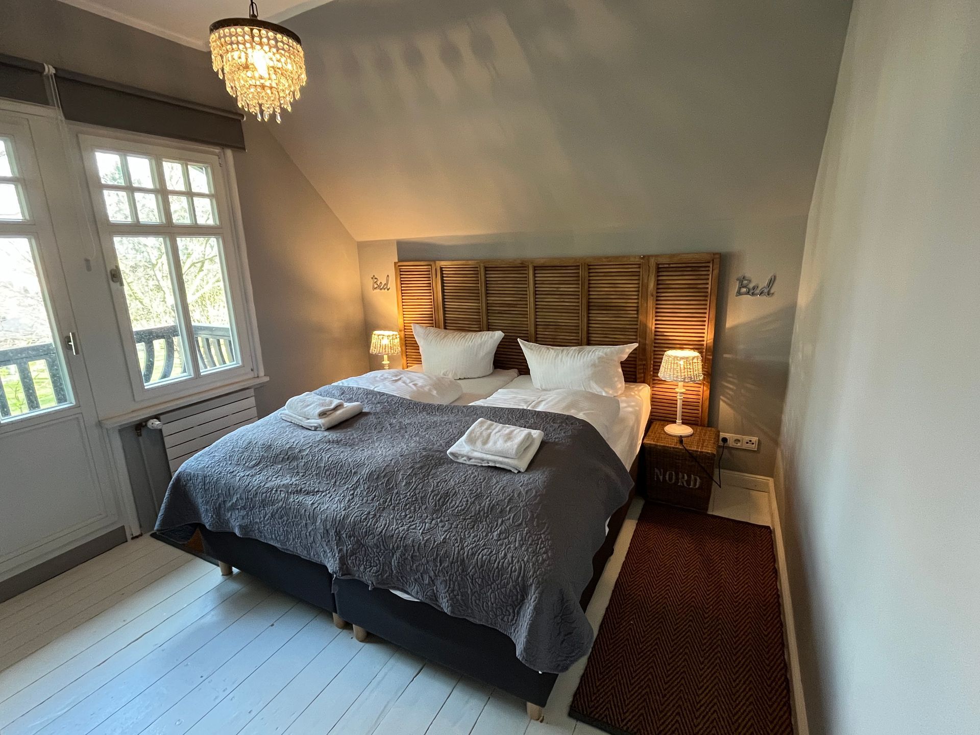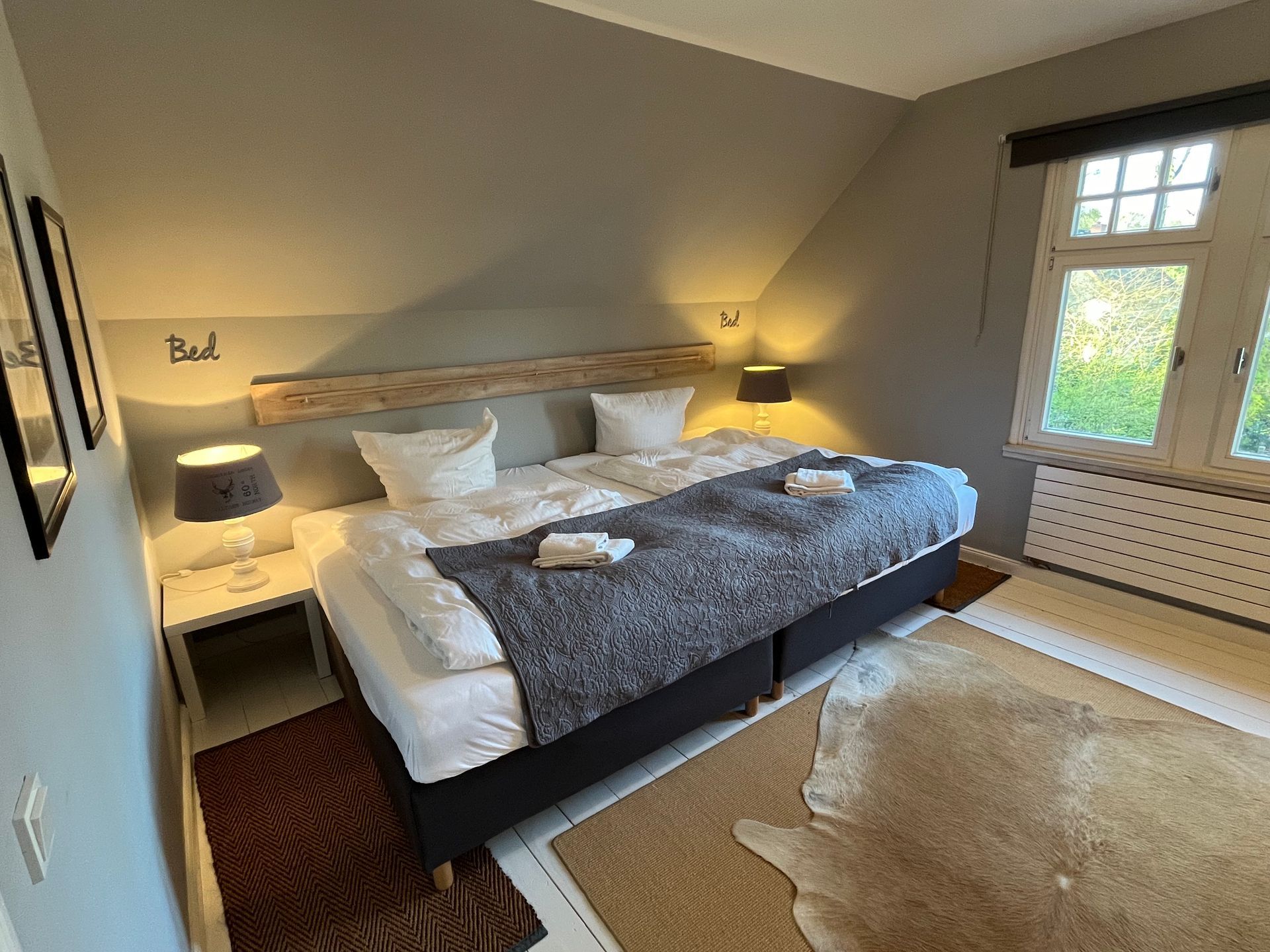 In einem großen Schlafzimmer im Obergeschoss stehen 2 Betten mit je 1,40 m. Breite zur Verfügung. Das Schlafzimmer daneben verfügt über ein Doppelbett und einen kleinen Balkon. Ebenfalls im Obergeschoss befindet sich ein Badezimmer mit zwei Waschbecken, frei stehender Badewanne und einer Toilette.
